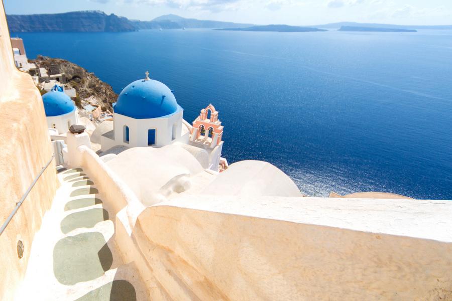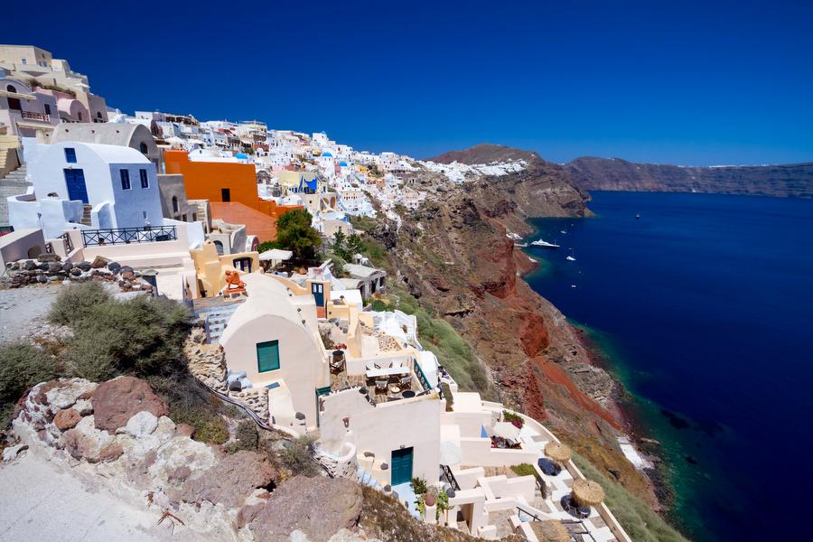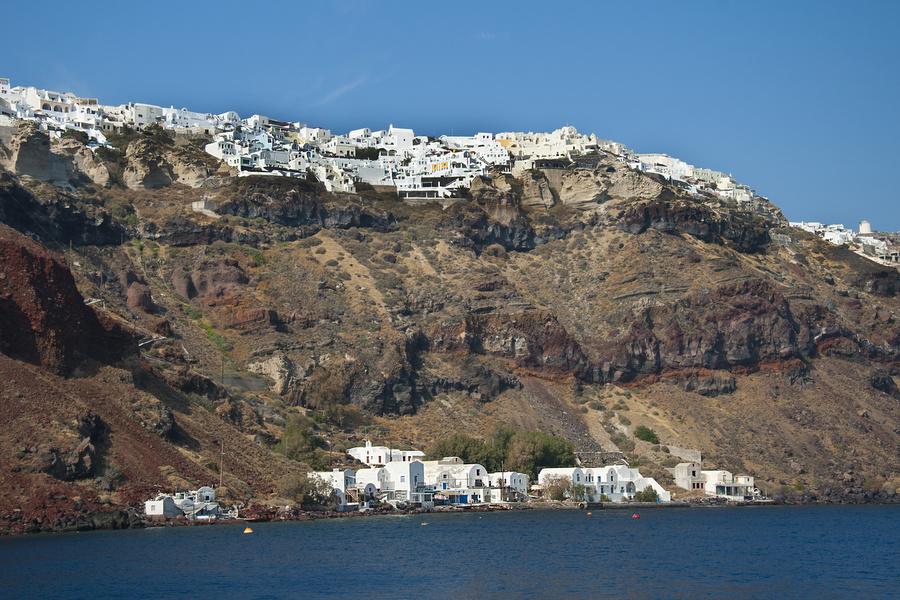 La ville de Santorin est en hauteur et sur des falaises larvaires comme elle a été formé de plusieurs volcans. En vous approchant, vous avez une vue impressionnante sur les falaises émergeant de l’eau dont les sommets sont décorées avec des maisons blanches lumineuses. Les maisons blanchies à la chaux, des églises aux dômes bleus et les roches volcaniques nues forment un contraste brillant. C’est la raison que Santorin est l’île la plus photographiée de la Grèce.