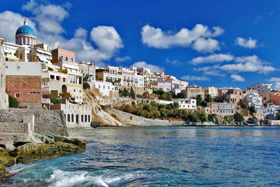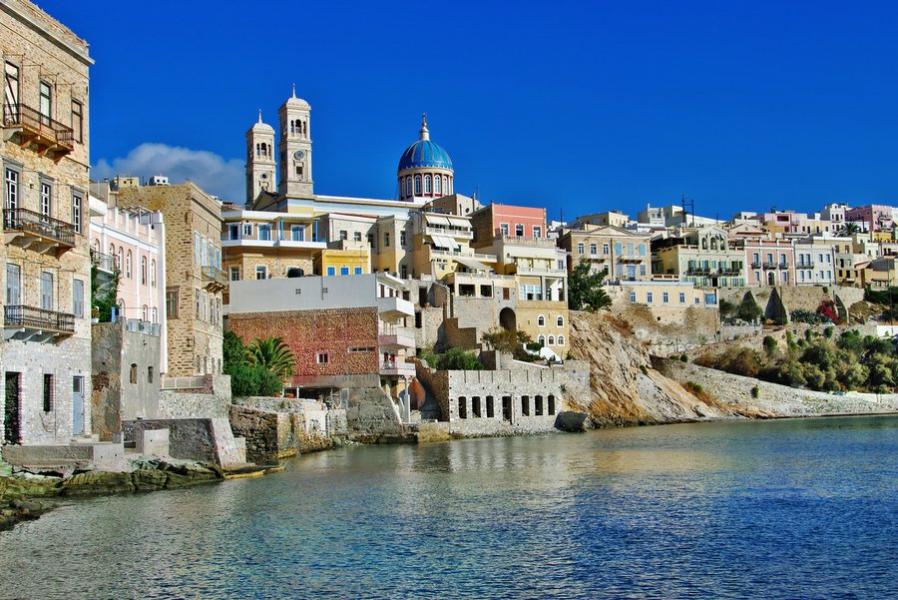 L'île de Syros, d'une superficie de 86 km2, est une étrangère au milieu des Cyclades. Toutes les autres îles sont caractérisées par des maisons cubiques blanches, mais la capitale de Syros (Ermoupolis) possède de majestueuses demeures de style néoclassique et vénitien. Syros a 20.000 habitants et sa ville est la capitale des Cyclades. Entrez dans cette capitale chic, c'est très impressionnant. La ville est construite sur deux collines et donne sur la mer. Au sommet des collines se trouvent deux églises, une orthodoxe et une catholique romaine.