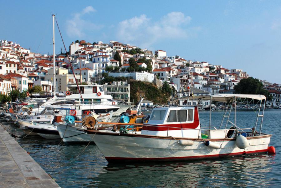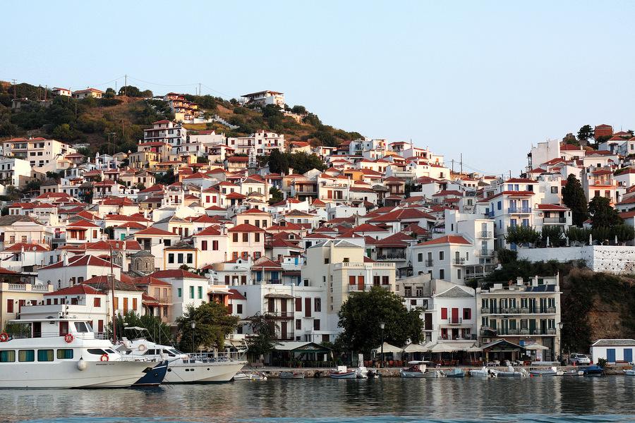 Le village de Skopelos est composé de maisons blanches traditionnelles aux toits orange qui sont construits sur une montagne. Le centre est très charmant et animé. Partout, on y trouve de vieilles églises et des places confortables. . On peut s’y perdre grimpant sur le haut de la colline à travers les rues étroites. La récompense est une vue magnifique sur la baie. De la ville, il y a caïques pour la belle, mais difficile à atteindre, la plage de Glisteri.