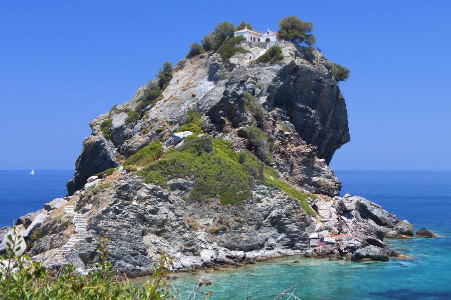 Skopelos est une île verdoyante, montagneuse avec une côte sauvage a falaises abruptes et baies avec quelques belles plages entouré de pins et une eau bleue claire. Tous les ci-dessus ont contribués sans doute la raison pour laquelle la majorité des scènes du film «Mama Mia » (2007) avec Pierce Brosnan et Meryl Streep ont été faites sur cette île. Ne manquez pas de visiter l’église sur le rocher entourées par les eaux c’est ici où la scène du mariage a été enregistrée. L’île est connue pour ses nombreux sentiers de randonnée dans la belle campagne et les nombreuses églises et monastères. Pour en savoir plus sur Skopelos.